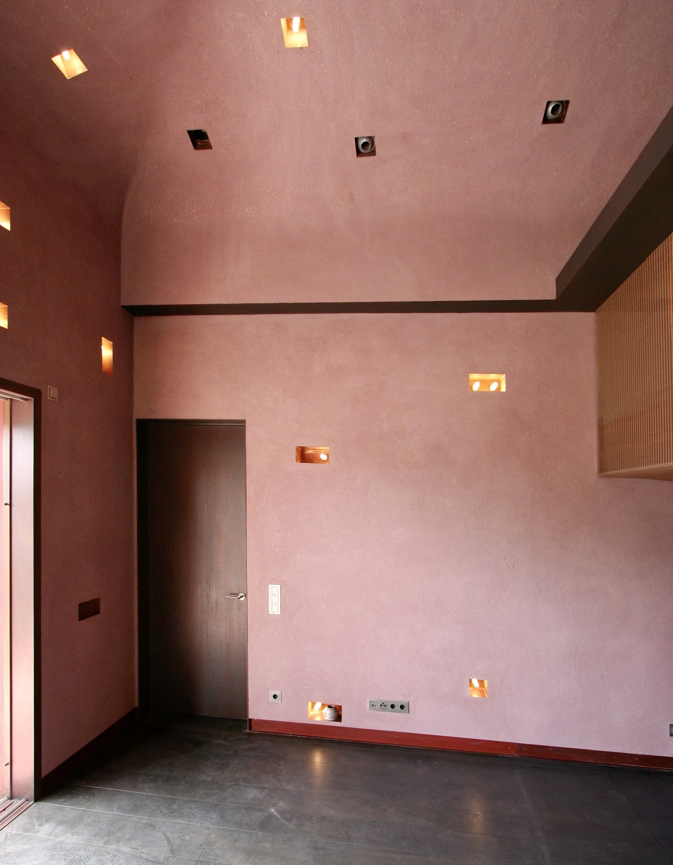 Clay building Tierrafino Finish 100% Ayers-Rock with pigments, applied on walls and ceilings of a private villa in Mallorca, Spain. Even in ultra-modern villas, clay construction has found its way in. The architect and the resident gave clay plaster the preferred role because of its breathable properties. We have been thanked many times for our realisation.