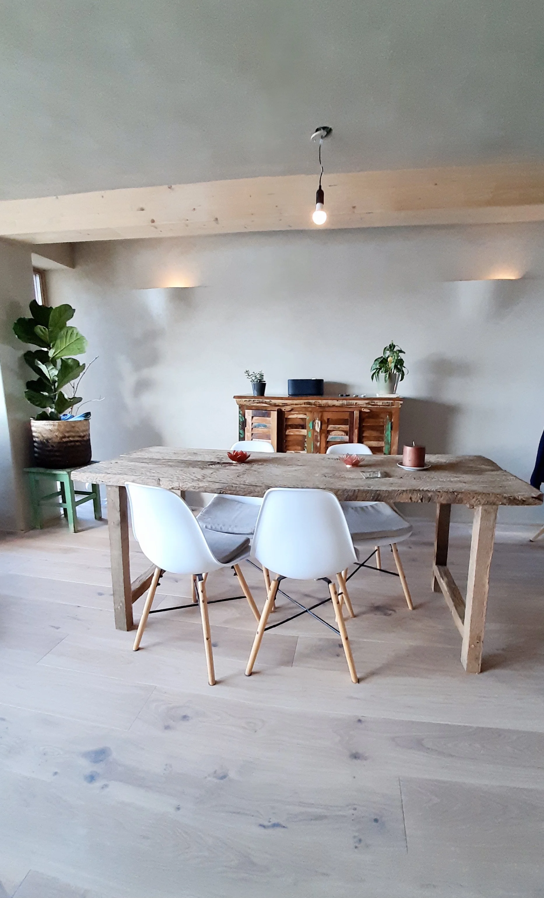 Earthen render Tierrafino ‘Base’ in a country house in the Netherlands with a three-layer clay plaster over reed mats. This ancient building method, which uses natural materials without any industrial additives and a mixture of white clay and sand, has a modern feel to it.