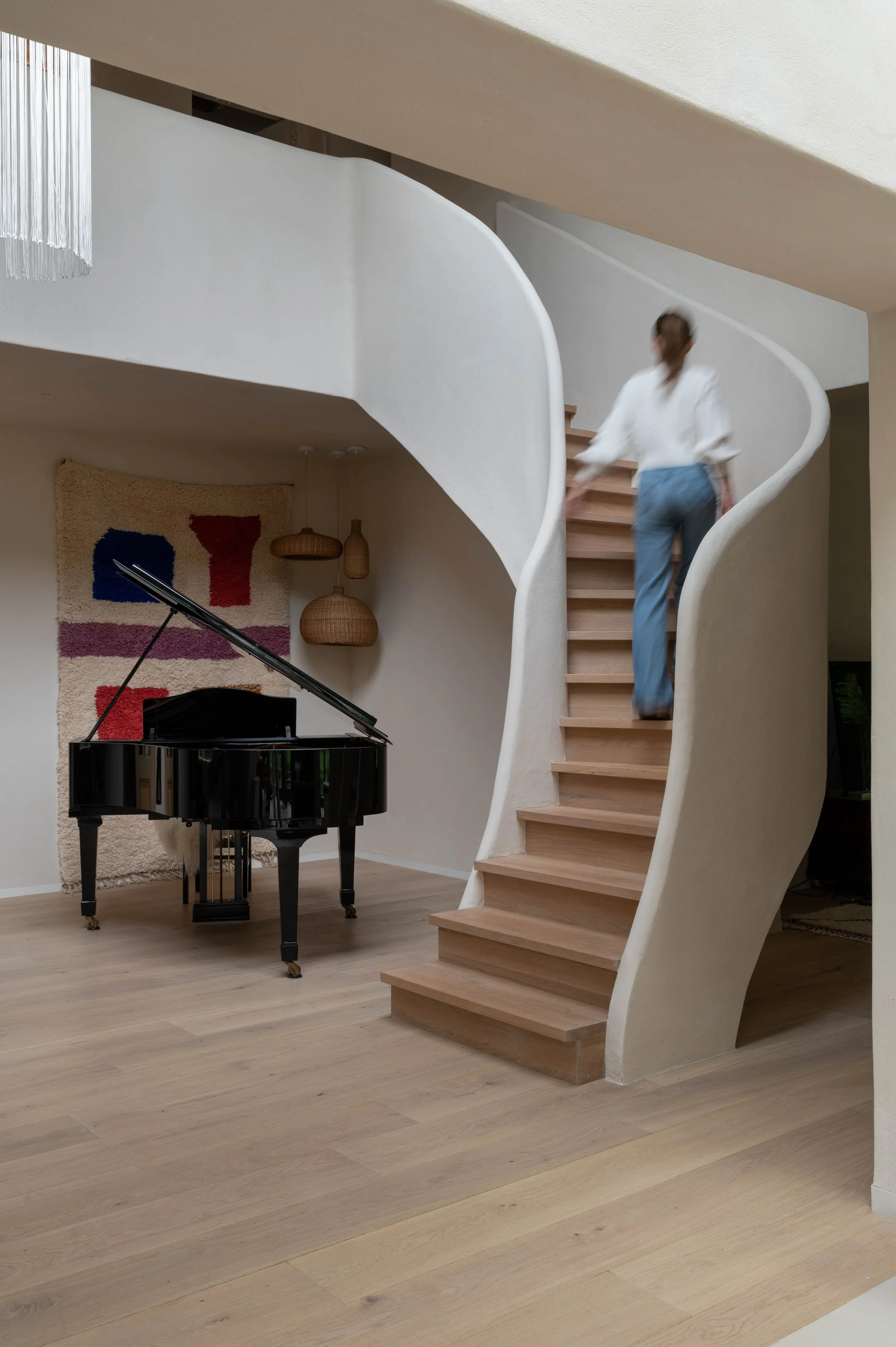 To ensure durability in high-traffic areas, such as the stairs, we applied the primer Fix. This additional layer not only strengthens the surface but also maintains the plaster’s stunning look over time.
