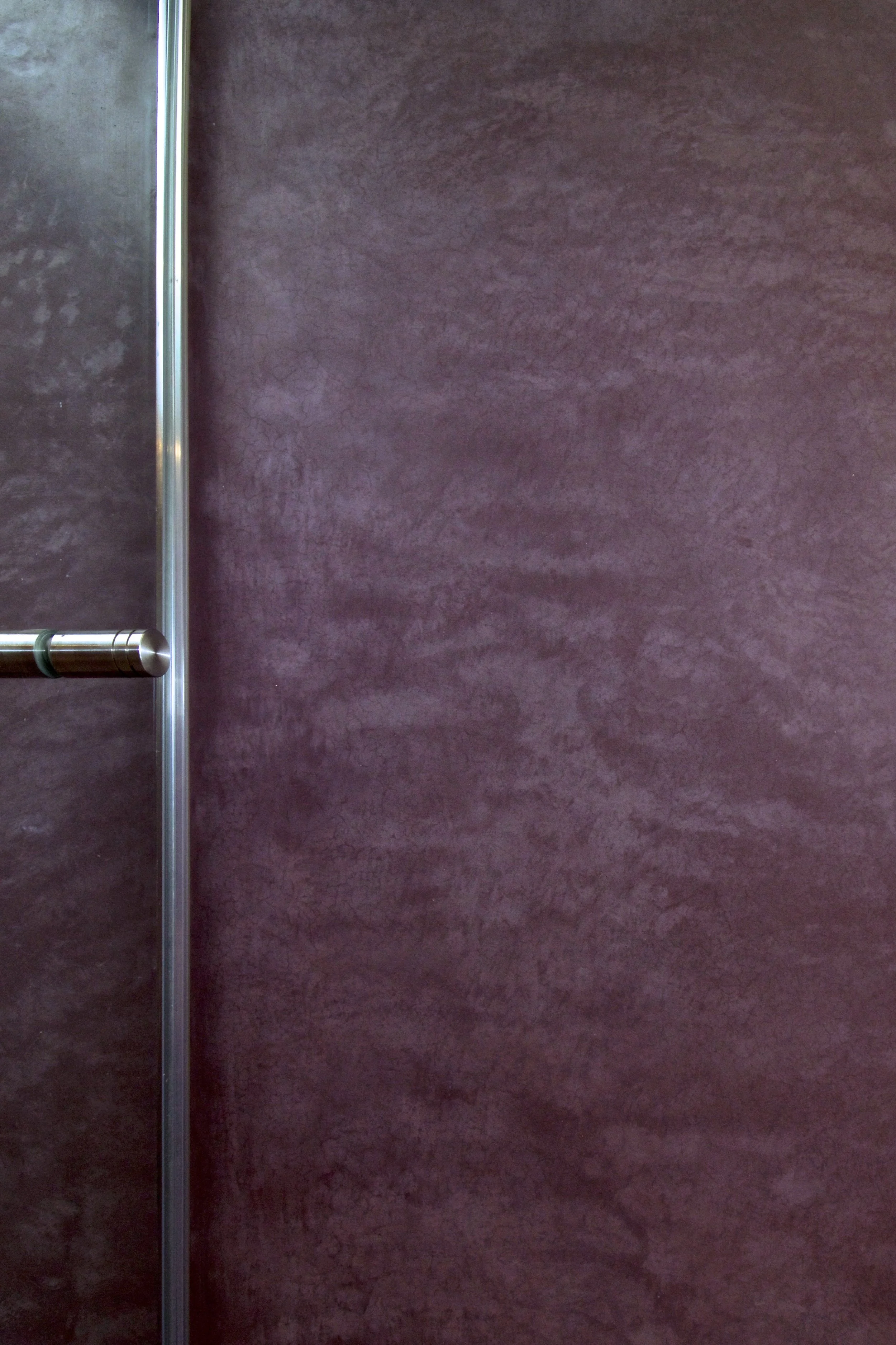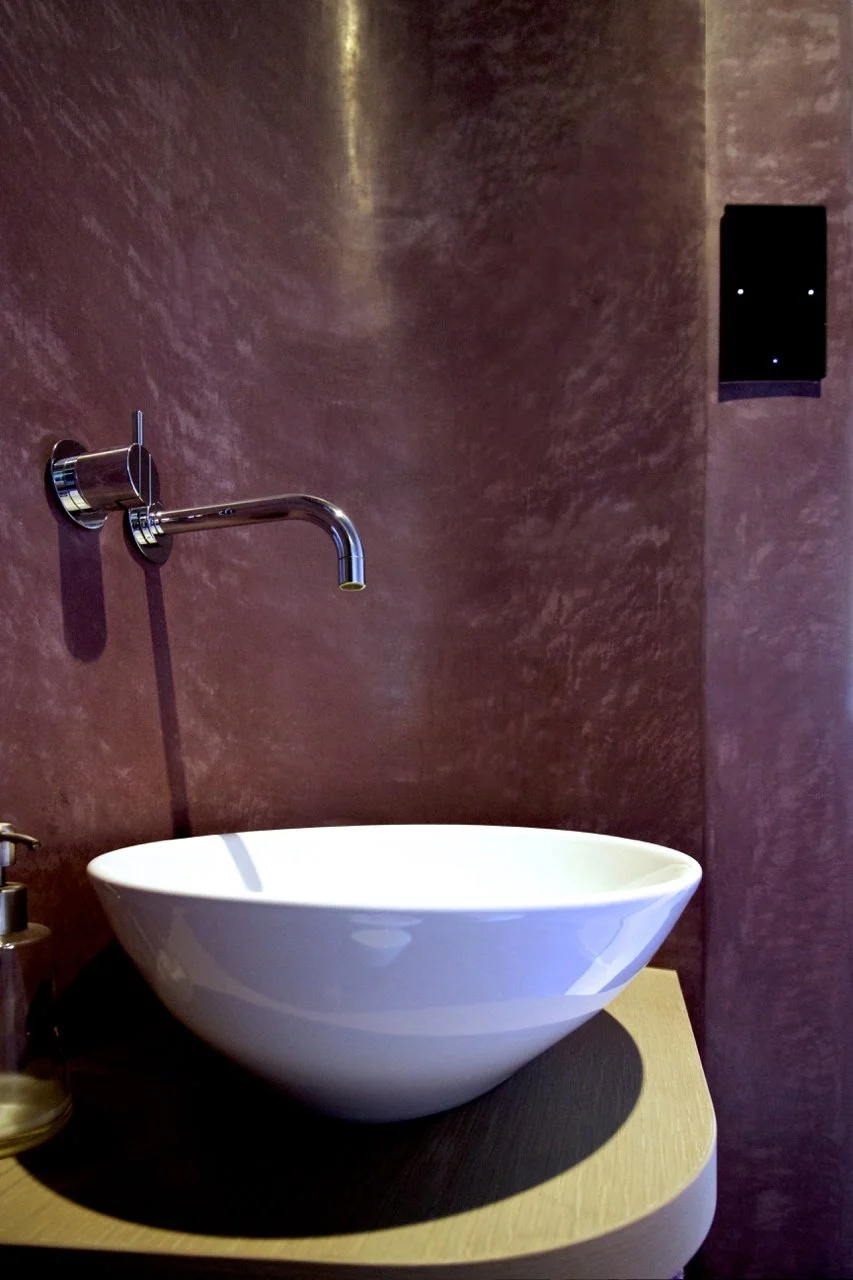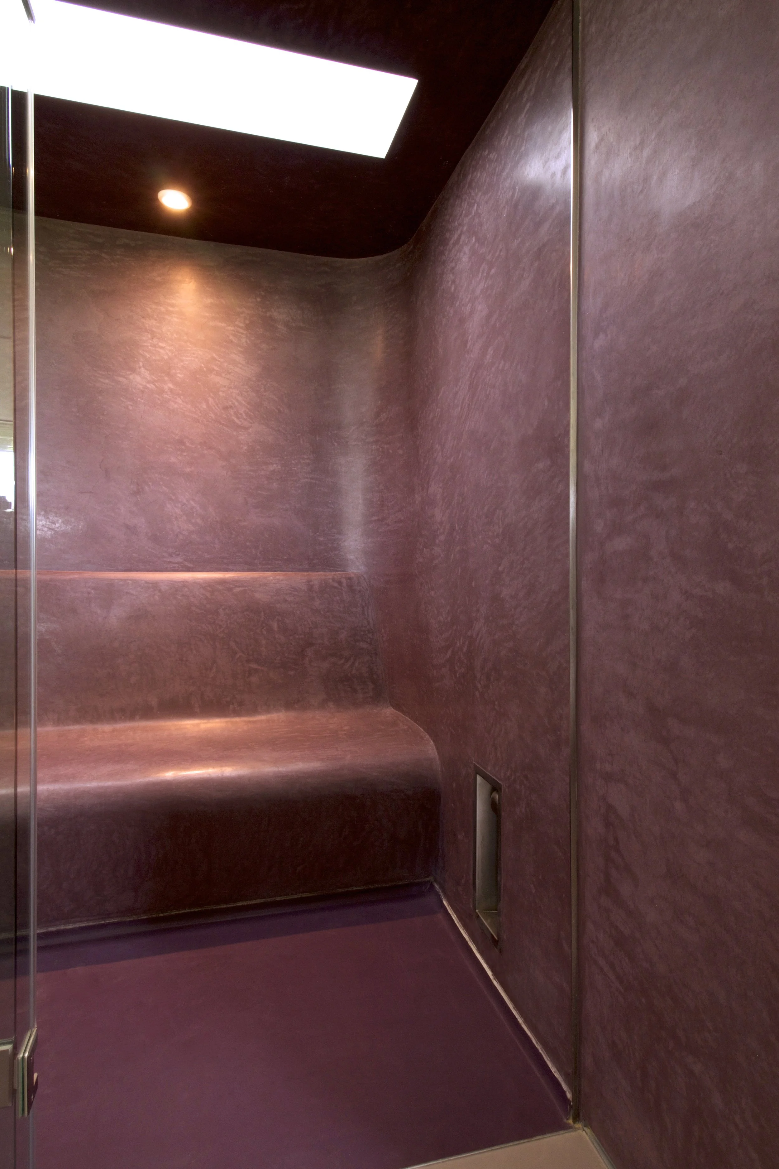 Tadelakt lime plaster mortar in a sauna in a private house in Bergen, North Holland. Coloured with a mixture of cobalt blue and mahogany pigments. All tadelakt surfaces are finished with a ground semi-precious stone and polished to a high shine.