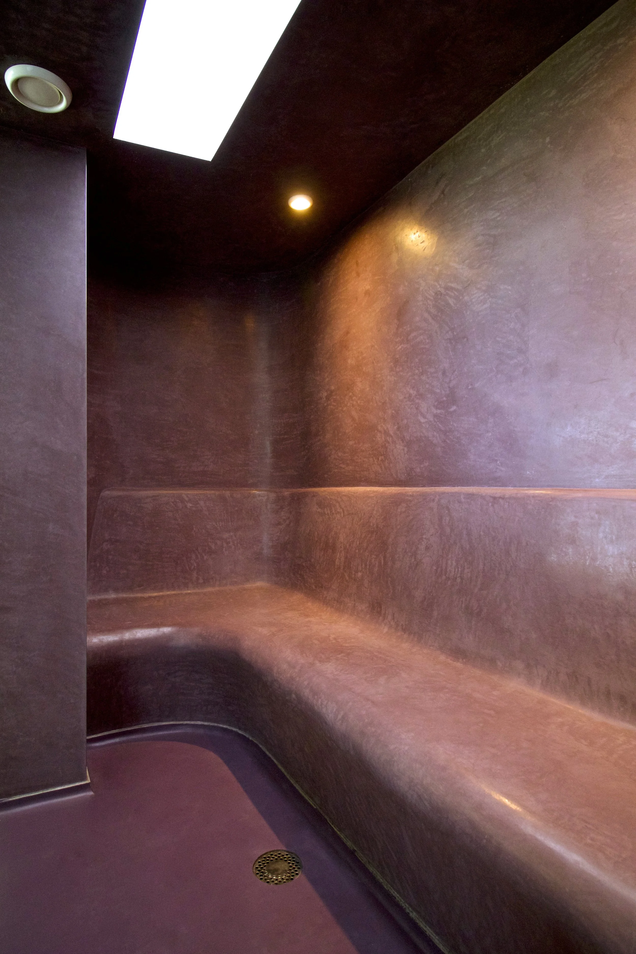 This very impressive sauna design with Tierrafino Tadelakt lime plaster mortar was designed by the Amsterdam-based architectural firm UNstudio from Amsterdam and executed with our best tadelakt craftsmen Martijn Heinsius and Pavel Pakuza. The homeowner still praises us for this work of art.